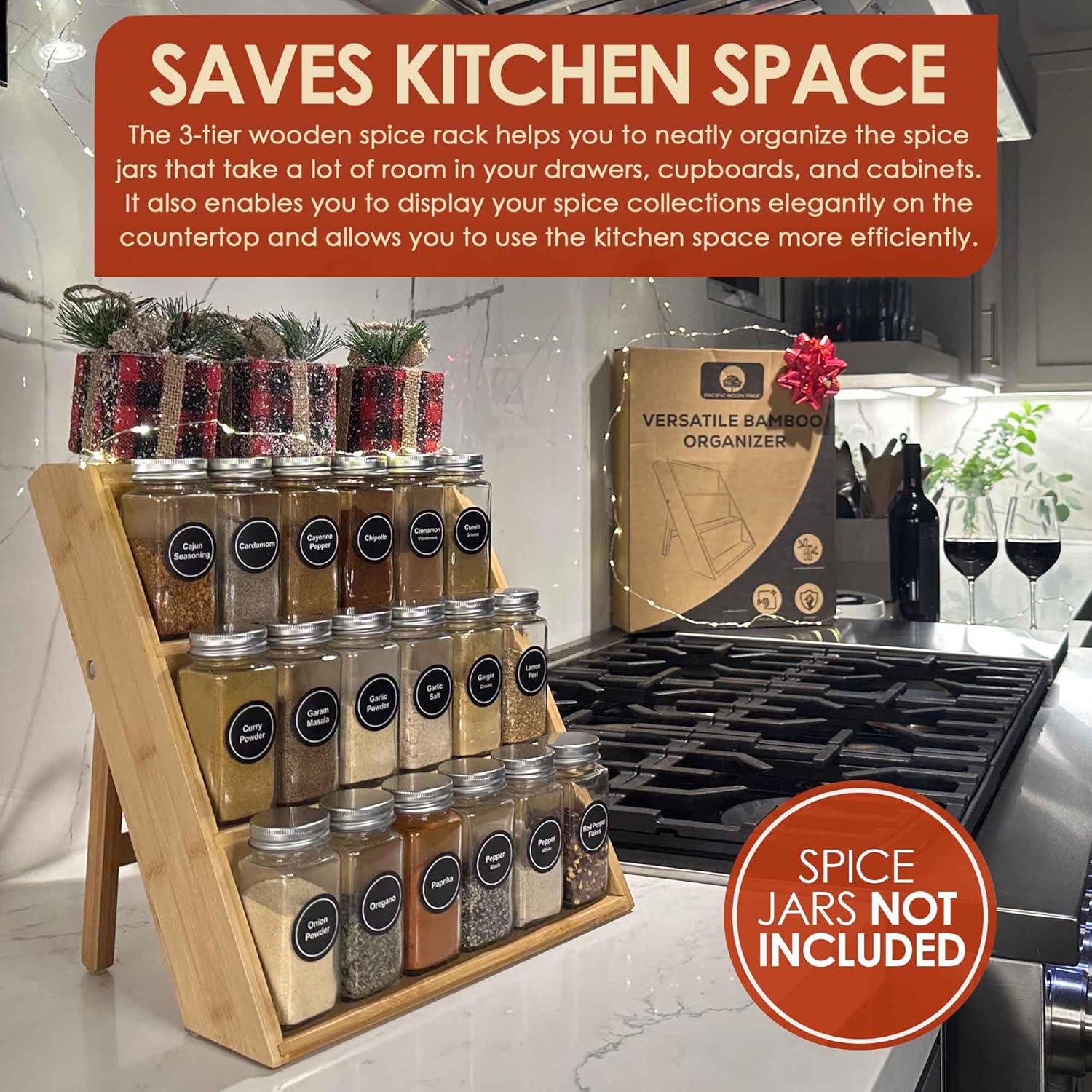 Introducing the Bamboo Spice Rack and Organizer, a versatile 3-tier seasoning spice jar organizer designed to enhance your kitchen organization. This excellent tiered wooden spice rack is perfect for free-standing use on cabinet drawers or countertops, providing easy access to your favorite spices and seasonings (spice jars not included).